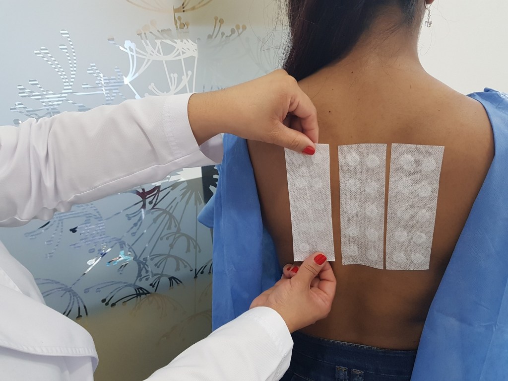 Sobre la piel se aplican parches de tela adhesiva hipoalergénica que contienen alérgenos contenidos en pozos de polipropileno y así identificar si el contacto con la piel por no menos de 48 horas desencadena dermatitis de contacto.